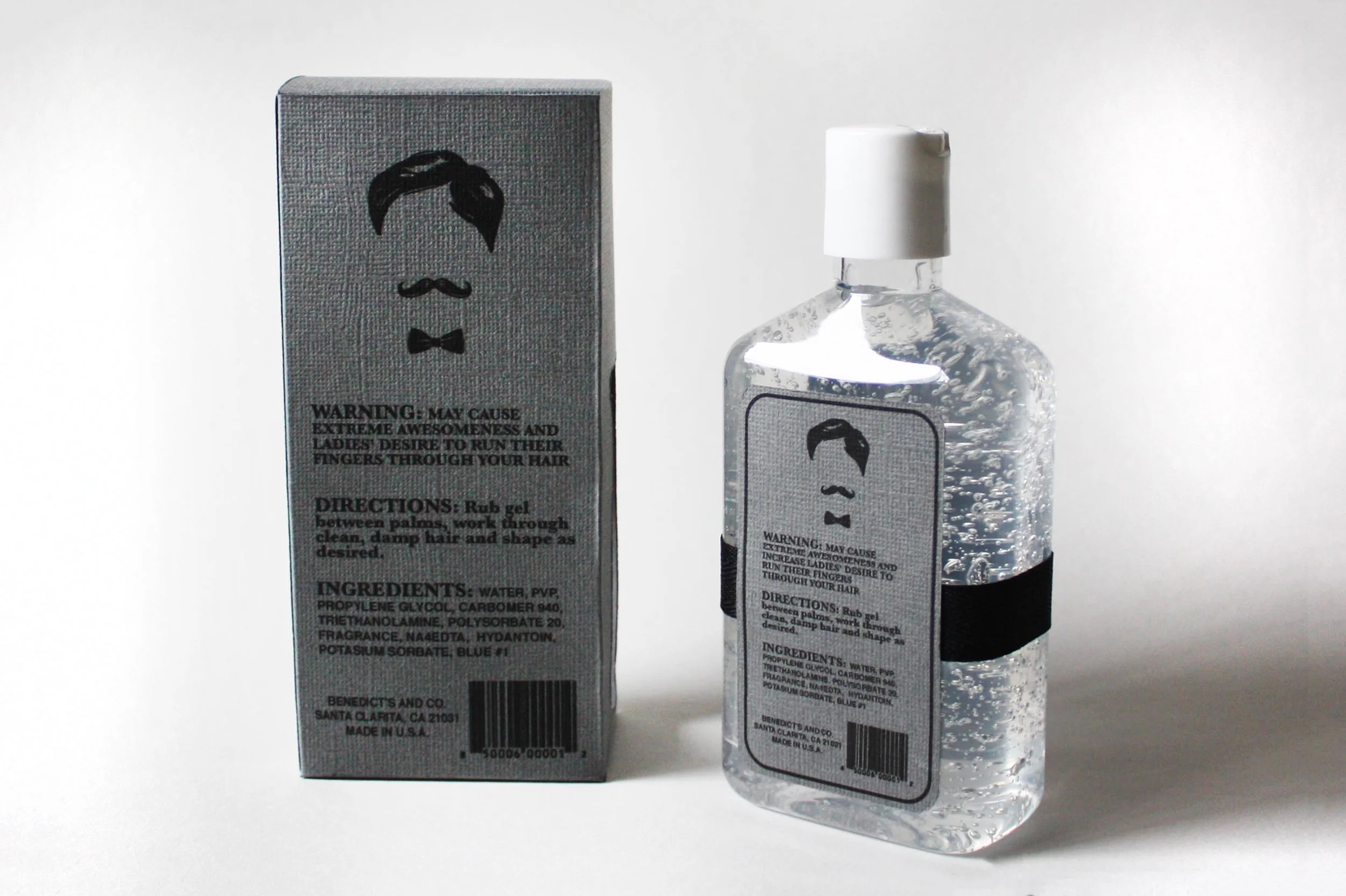 This is a package design for a sophisticated men’s hair gel brand. It is printed on grey linen paper, utilizes a clear bottle package, as well as a containing box. The goal of this packaging was to create an upscale hair gel that was marketed towards “classy” gentleman that are interested in the refined look. The bottles packaging also incorporates a black cotton ribbon in order to tie the front and back design together and add another element of texture.