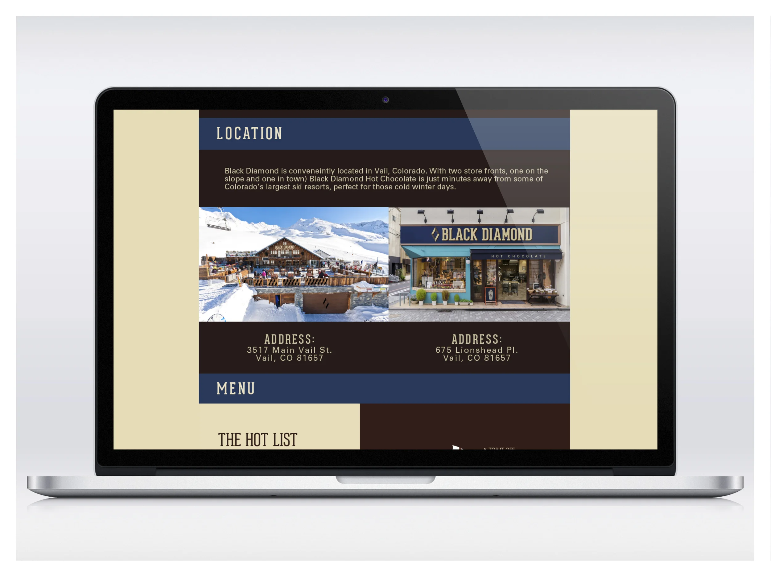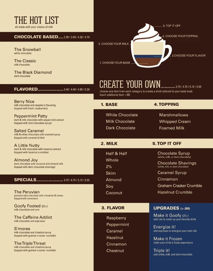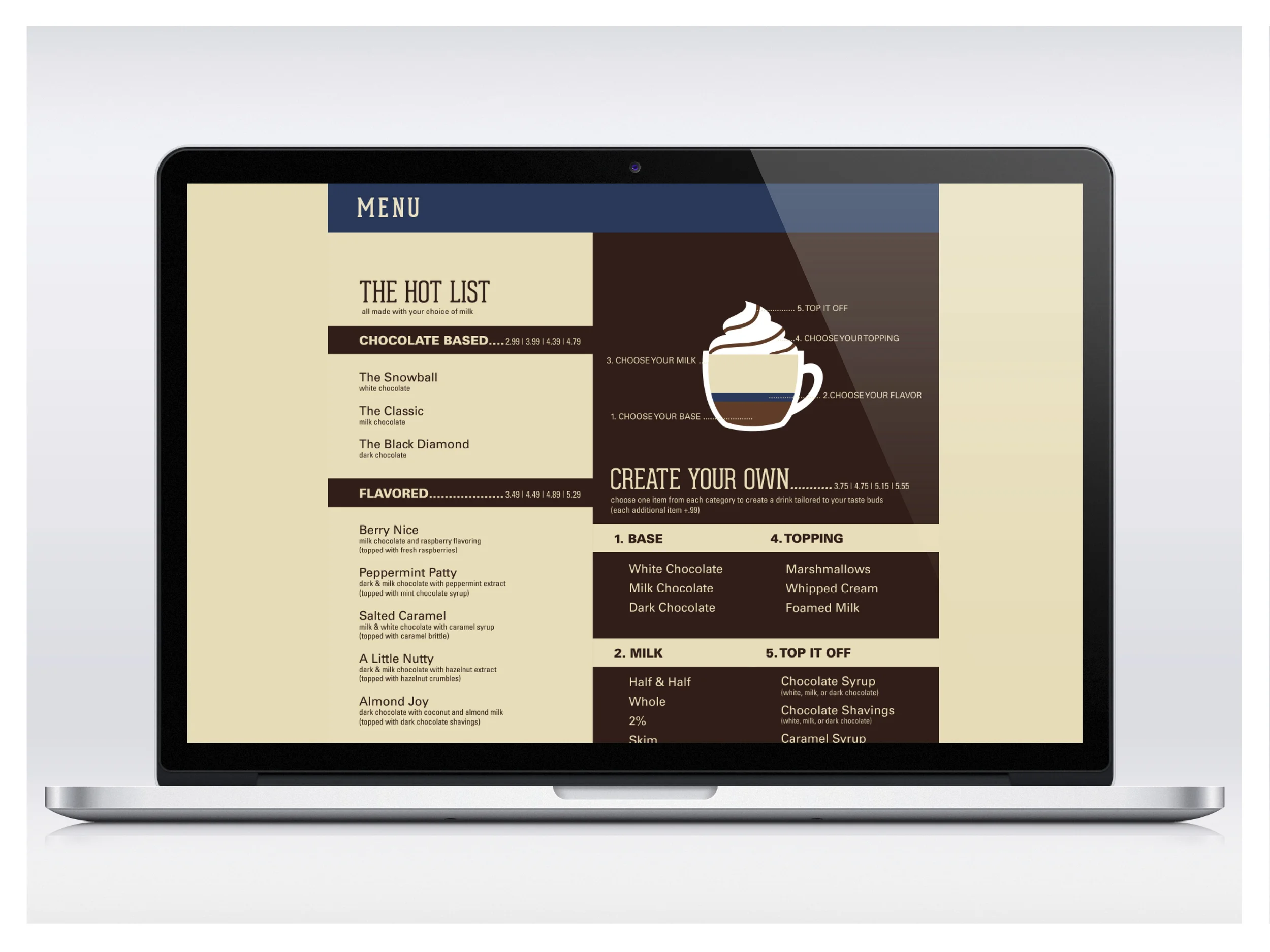 A wall menu was designed to help walk customers through the process of creating your own cup of hot chocolate. This menu also suggests some popular flavor combinations.