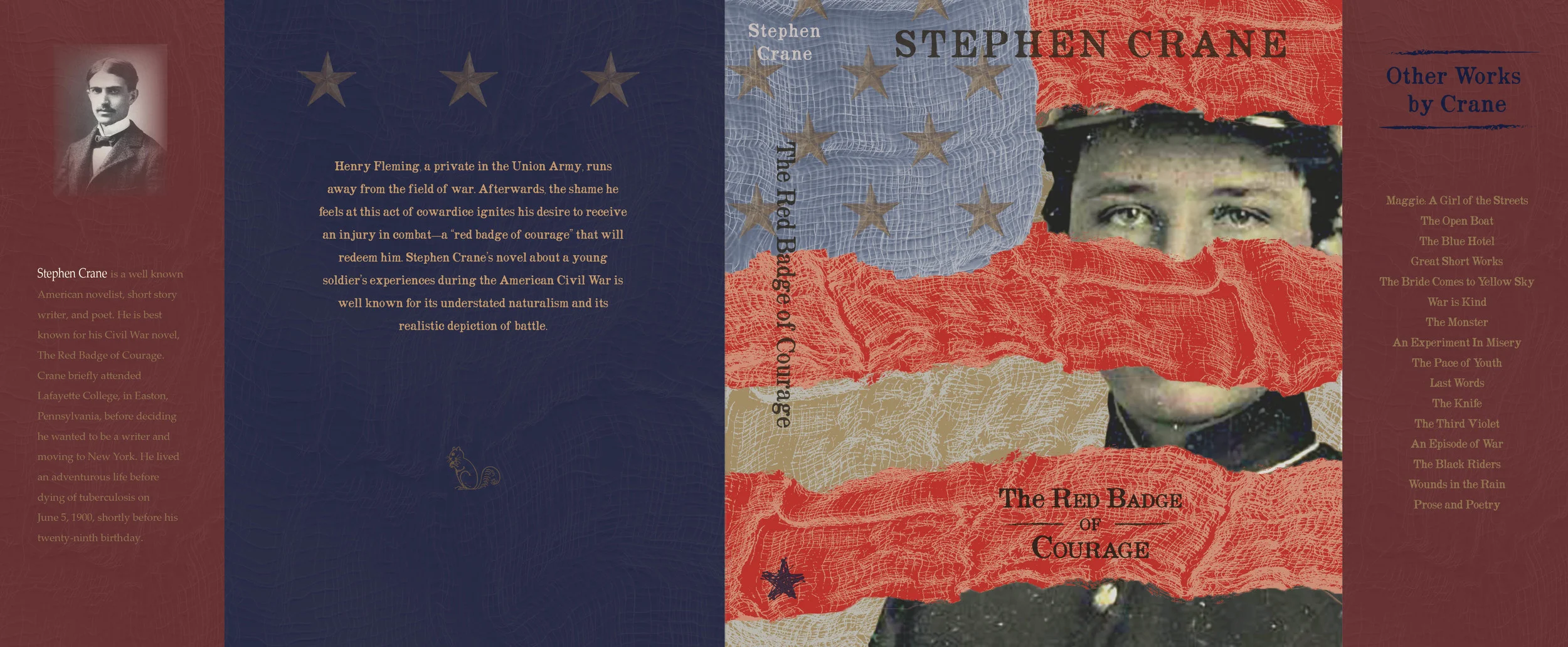 A book cover was designed for Stephen Crane's book The Red Badge of Courage keeping in mind the strong themes that are represented throughout the book: patriotism, war, and courage. Throughout the main characters journey as a civil war soldier, he finds himself dwelling on the idea that you need to be injured in war to become a hero. This connection of pride and injury is represented on the cover by using medical gauze to form the American flag imagery.