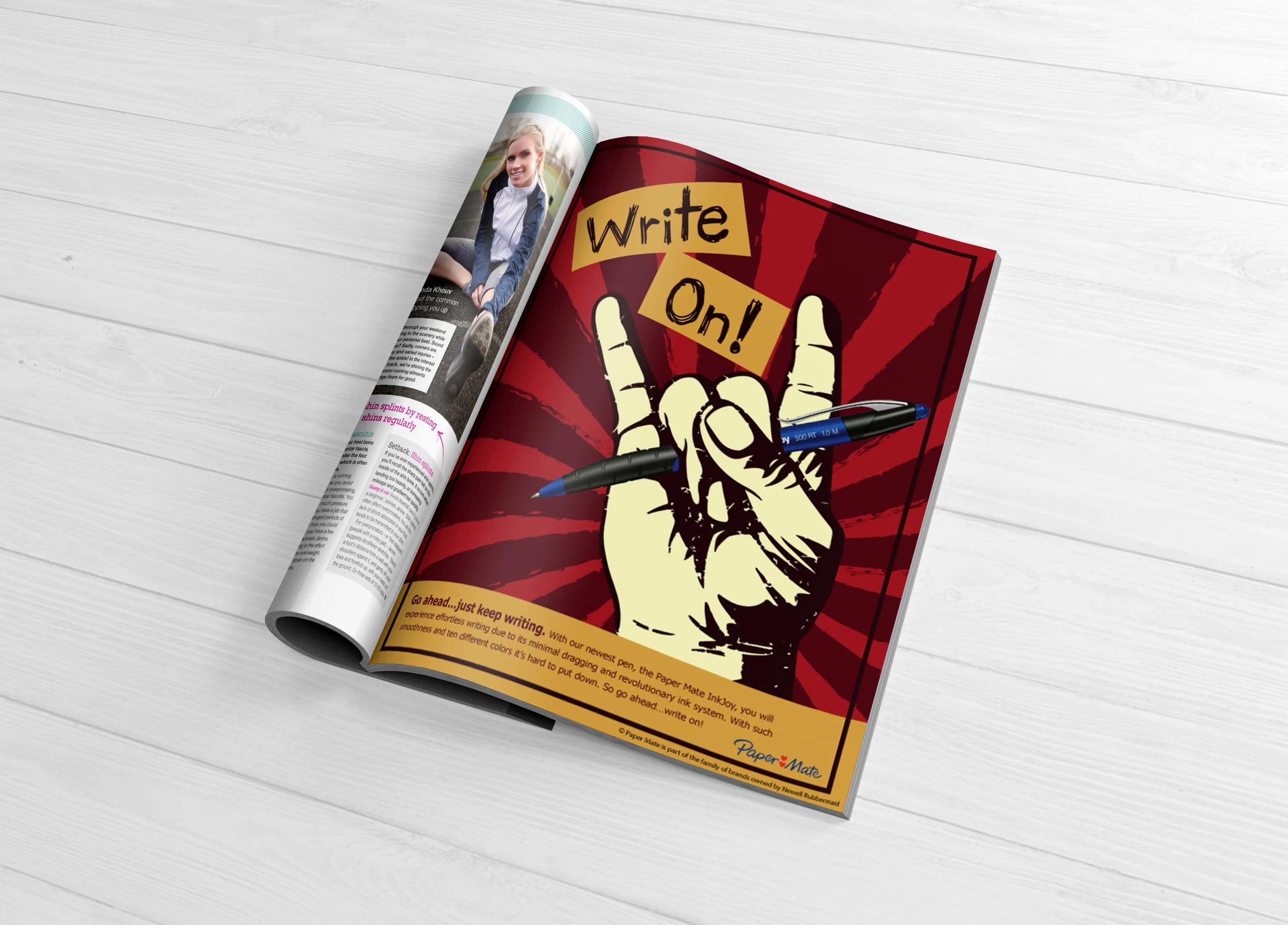 This ad is meant to emphasize the unique features of this pen but in a fun and creative way. Since Paper Mate is a brand that inspires creativity it was important to transfer this attitude into the advertisement that will be representing the product.The tagline "write on" alludes to the rock and roll saying, which is where the visual inspiration of this ad comes from.